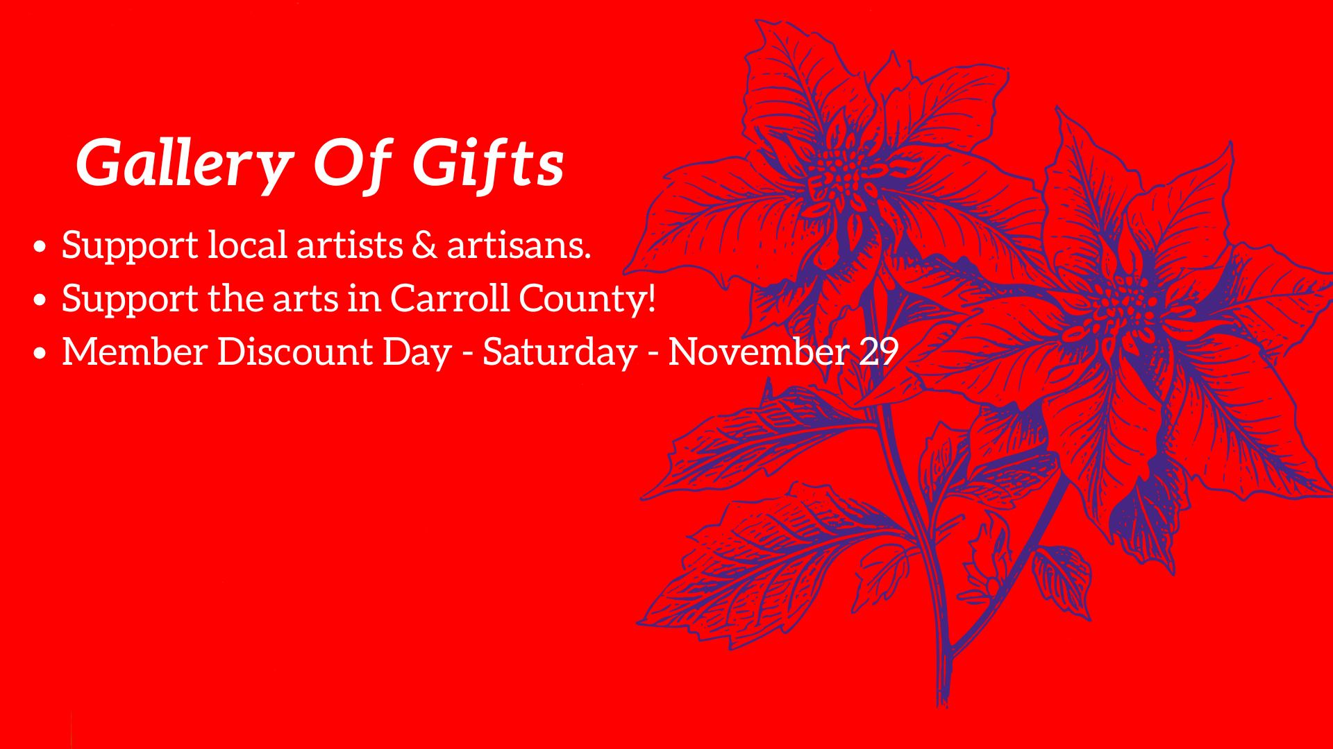 Member Discount Day for Gallery of Gifts. Carroll County Arts Council Members enjoy 10% off purchases from our 2025 Gallery of Gifts! Enjoy our holiday, boutique shopping experience, support local artists, artisans, small business AND arts in Carroll County. [...]