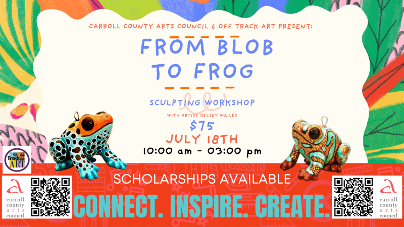 Carroll Arts CenterMake a frog! From a simple blob of clay to cute little finished froggy, explore how creating simple shapes and adding them together can make a unique and complex sculpt that is fun and easy to teach to your friends! Students will sculpt, cook, sand, and paint their work.