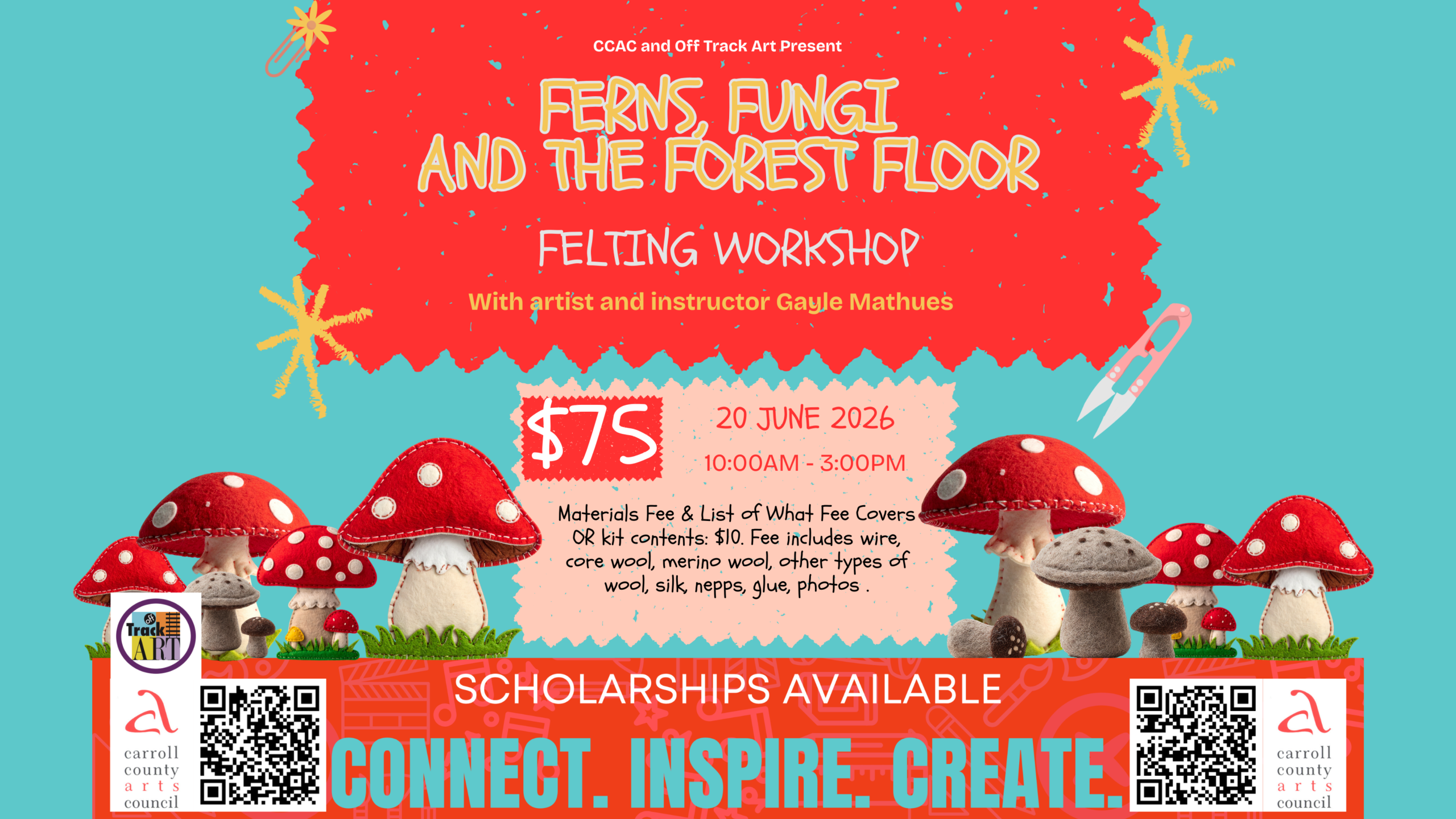 Carroll Arts CenterThis workshop will incorporate both wet felting and dry needle felting to create various mushrooms and ferns, small flowers and other debris found on a forest floor.Several different types of mushrooms call for different methods. Students will learn how to use a resist to create a conical mushroom cap as well as flat wet-felting and shaping. Students will learn how to create ferns using wire and wool and heat and bond product.