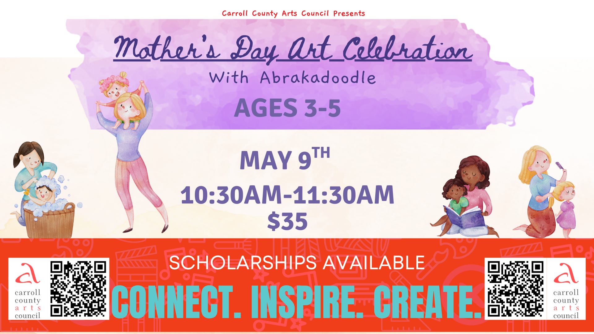 Carroll Arts CenterHave fun while we celebrate this special day! Share your creativity as we make a beautiful portrait of your mom or anyone who’s special to you. We’ll color, roll, pinch and pull clay, adding bright and colorful touches to show your love!