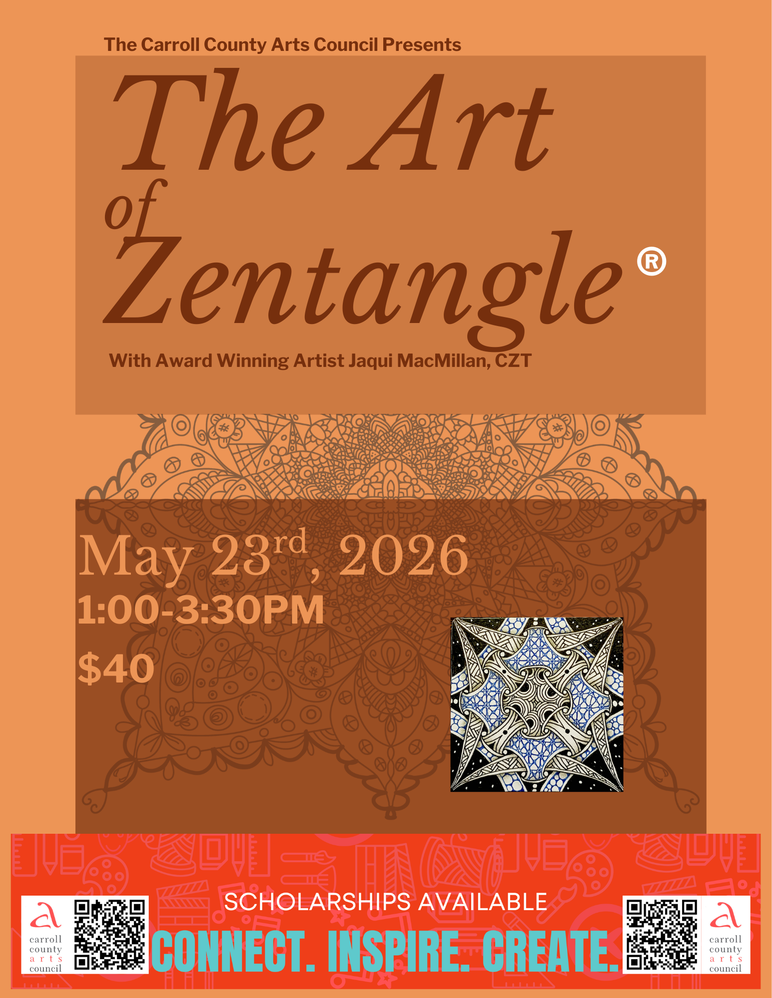 Carroll Arts CenterDiscover the Zentangle® Method—an easy-to-learn, meditative, and joyful way to create beautiful art through simple, structured patterns. In this relaxing class, you’ll learn how simple lines and patterns can flow together to create stunning art.