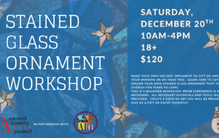 Make your own holiday ornament to gift or hang in your window or on your tree. Learn how to cut and solder your own stained glass ornament that you can cherish for years to come. This is a beginner Workshop, prior experience is not necessary. All necessary materials and tools will be provided. Create a piece of art you will be proud o to give as a gift or enjoy yourself!
