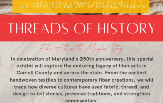 The Carroll County Arts Council, in partnership with the Historical Society of Carroll County, celebrates Maryland’s 250th anniversary with a special exhibition: Threads of History: Fiber Arts and the Maryland Story. This special exhibition features works by 15 artists and the collection of the Historical Society of Carroll County range from the earliest handwoven textiles to contemporary fiber creations. These works highlight the rich tapestry of our shared Maryland history and tell the story of how diverse cultures have used fabric, thread, and design to preserve traditions and to strengthen communities across Maryland.
